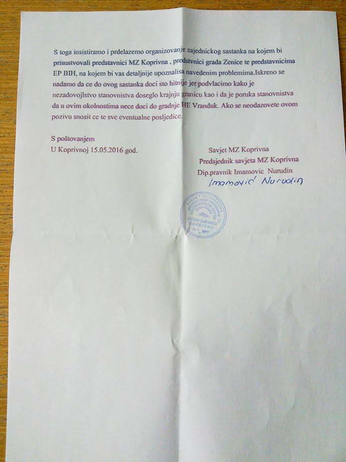 Iz MZ Koprivna se nadaju da će doći do ovog sastanka što hitnije, jer kako kažu u dopisu, da je „nezadovoljstvo stanovništva doseglo krajnju granicu i da je poruka stanovništva da u ovim okolnostina neće doći do gradnje HE Vranduk. Ako se ne odazovete ovom pozivu, snosit će te sve eventualne posljedice“-, kaže se na kraju dopisa savjeta MZ Koprivna.