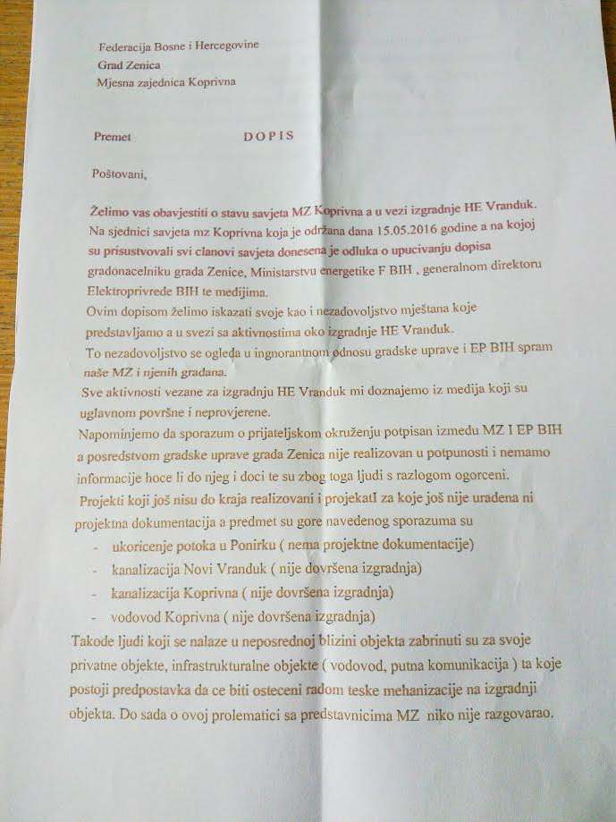 U dopisu iznose stav savjeta MZ Koprivna u vezi izgradnje HE Vranduk i nezadovoljstvo mještana, koje oni predstavljaju, a u vezi aktivnosti oko izgradnje HE Vranduk.