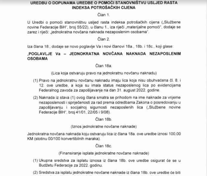 Nezaposleni u Federaciji Bosne i Hercegovine, oko 270.000 njih, će izmjenom Uredbe o pomoći stanovništvu koja će se danas naći na sjednici Vlade Federacije BiH u Mostaru, dobiti po 100 KM pomoći.