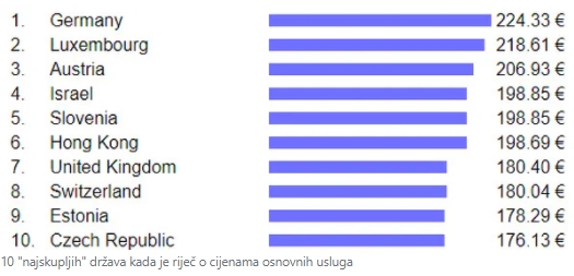 Ono što je interesantno, među 10 najskupljih država kada je riječ o cijenama osnovnih usluga nalaze se samo dvije neevropske države tačnije Izrael i Hong Kong. Stanovnici ovih područja tako će za troškove izdvojiti 199 eura odnosno 198 eura.