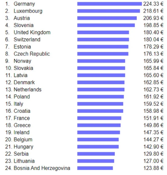 Prema statistici Numbea, Njemačka predstavlja ubjedljivo najskuplju državu kada riječ o prosječnoj cijeni osnovih usluga pa će tako građani ove zemlje platiti oko 225 eura za račune koji svaki mjesec dolaze na adrese građana.