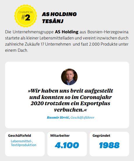 Njemački Market International pisao o AS Holdingu- Njemački magazin Market International objavio je nedavno članak afirmativnog karaktera o nekoliko uspješnih kompanija sa sjedištem na Zapadnom Balkanu, poručivši već u naslovu da se radi o “skrivenim liderima na svjetskom tržištu”. Jedna od kompanija koja je predstavljena u tekstu je i bosanskohercegovački lider prehrambene industrije AS Holding.