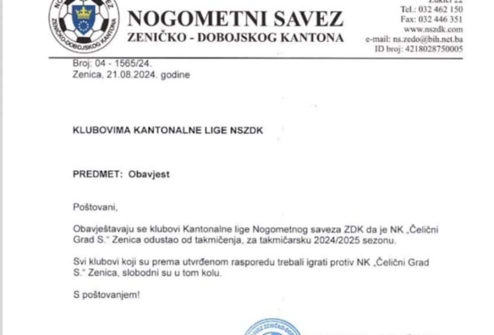 Nakon što smo objavili početak takmičarske sezone, 2024/2025.godina, u Kantonalnoj ligi Zeničko-dobojskog kantona (ZDK), danas smo dobili dopis u vezi odustajanja od takmičenja NK „Čelični Grad – Steel City“ za takmičarsku 2024/2025.
