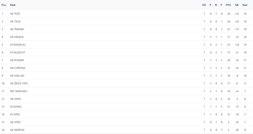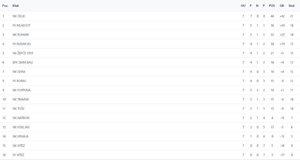 Tabela juniorske Omladinske lige BiH grupa Centar 2