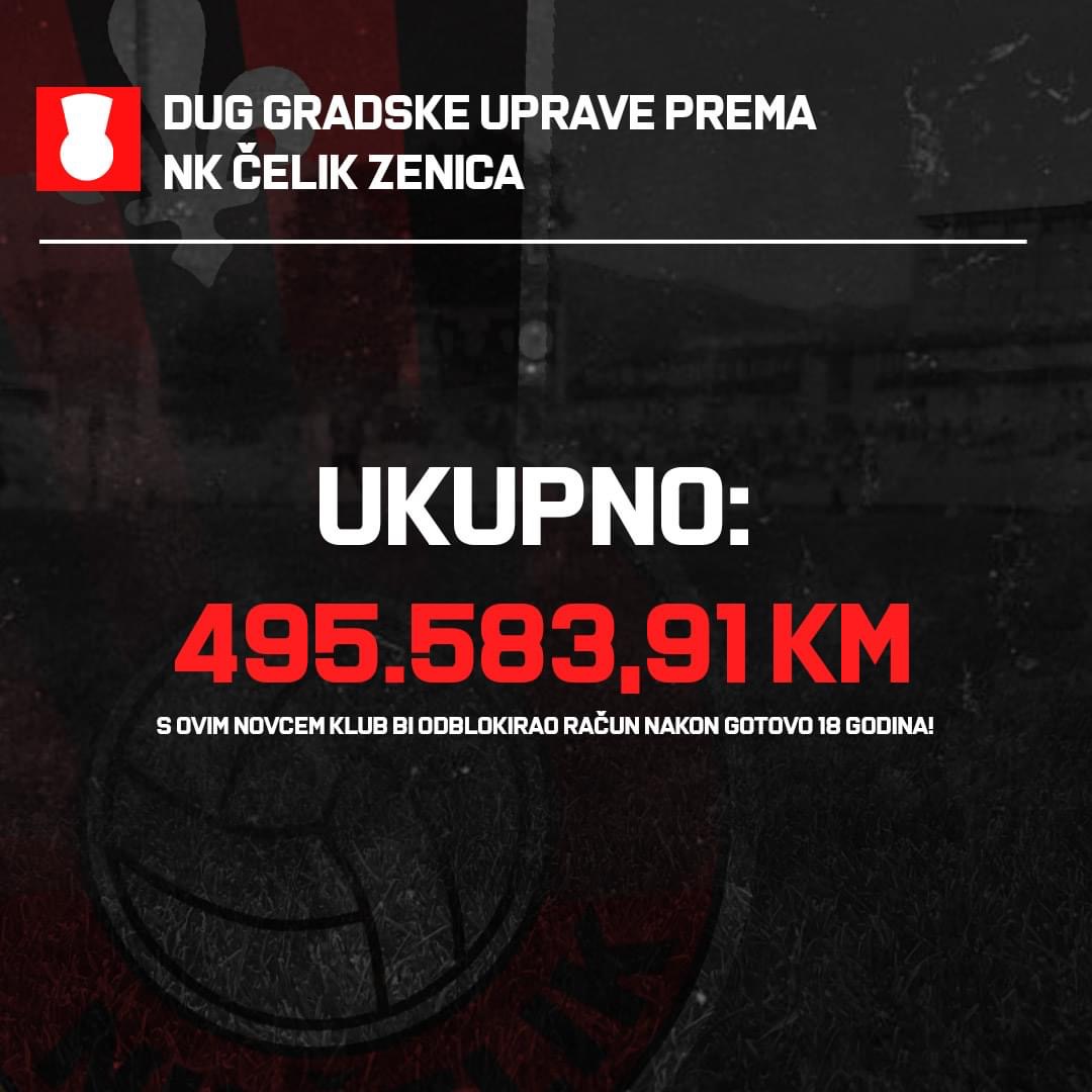 Zaključno s jučerašnjim danom, Grad je do sada propustio uplatiti i 24. ratu, a dospjeli dug Grada Zenica prema NK Čelik Zenica iznosi: 495.583,91 KM.