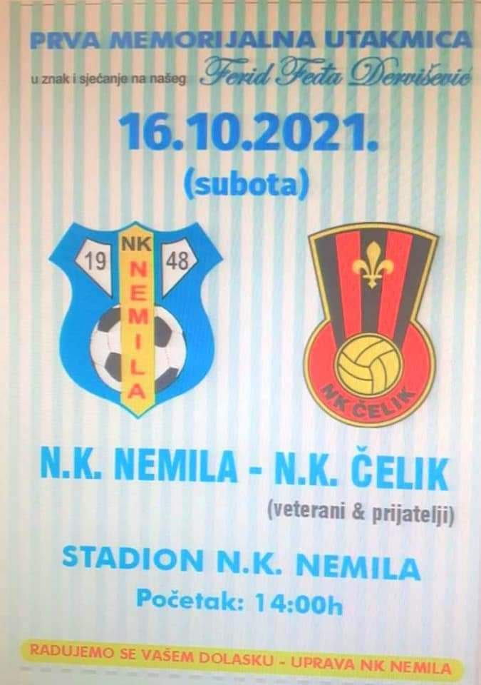 NK Nemila u subotu, 16. oktobra 2021. g. na stadionu “NK Nemila” organizuje prvu memorijalnu utakmicu u znak sjećanja na dugogodišnjeg predsjednika kluba Ferida Derviševića Feđe.
