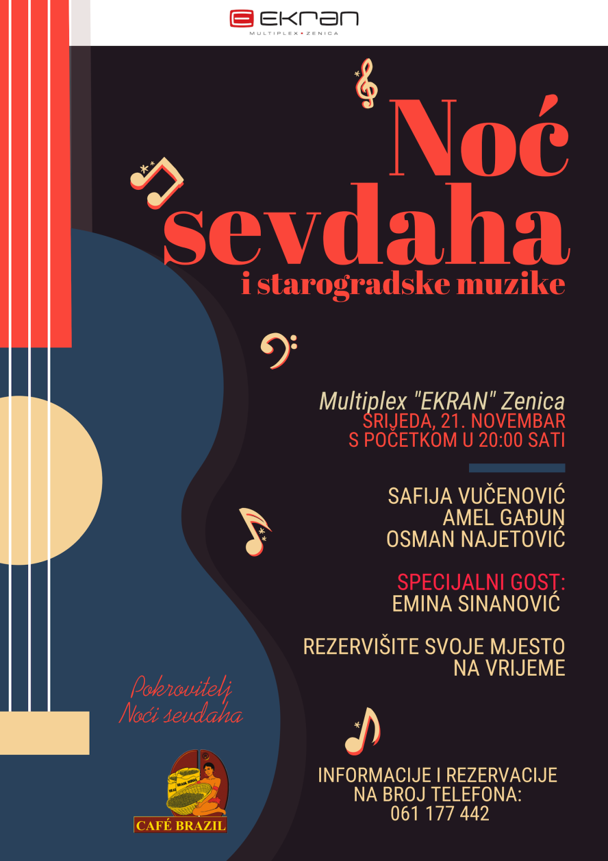 NOĆ SEVDAHA I STAROGRADSKE MUZIKE U MULTIPLEXU “EKRAN”  ZENICA – Multiplex „Ekran“ Zenica  u srijedu, 21. novembra organizuje drugu Noć sevdaha i starogradske muzike. Naime,  u ugodnom ambijentu multiplexa, publika će uživati u najljepšim sevdalinkama i starogradskim pjesmama u izvedbi Safije Vučenović, a uz muzičku pratnju Amela Gađuna i Osmana Najetovića.