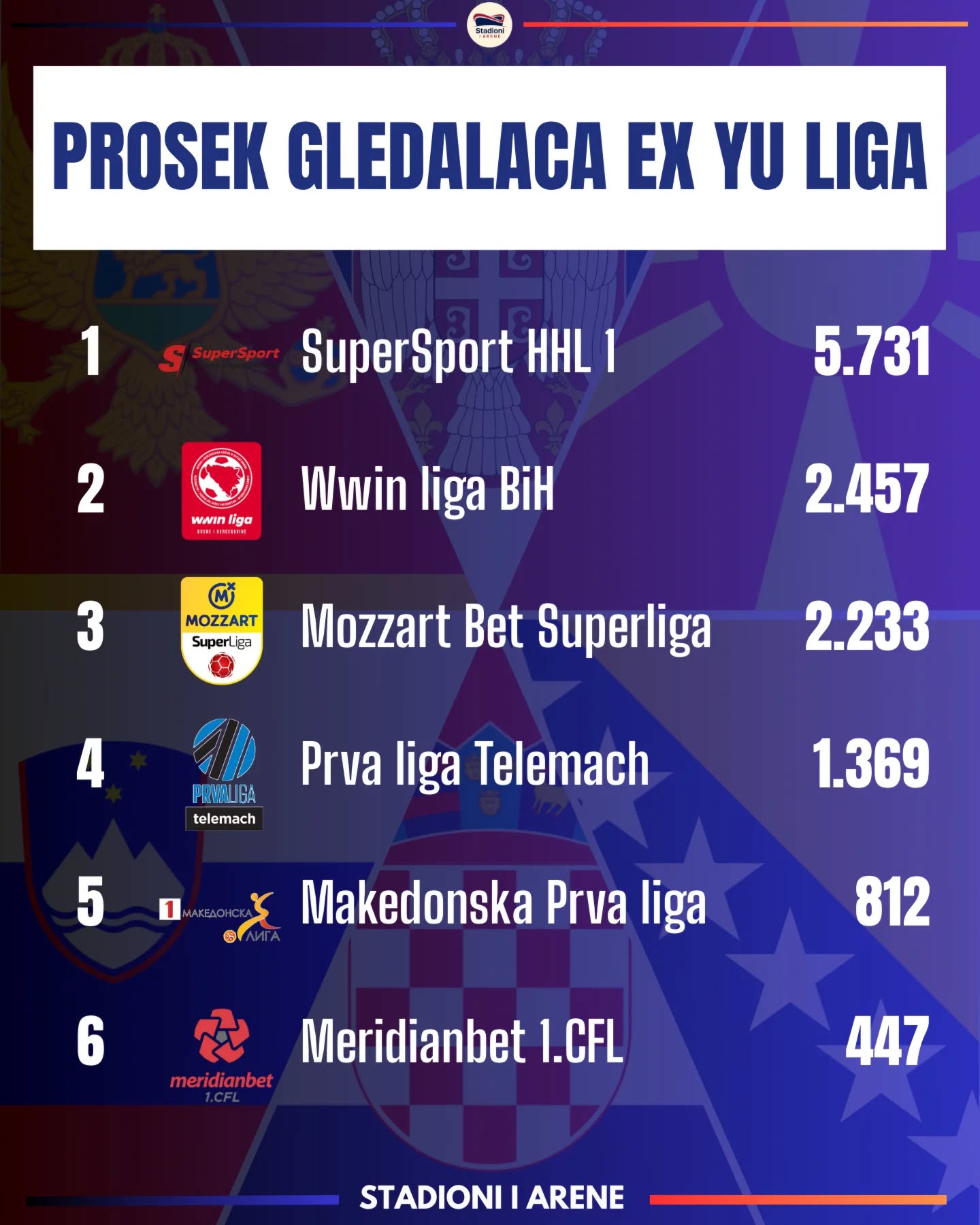 Srbijanska Superliga je tek na trećem mjestu sa prosjekom od 2.233 gledatelja po utakmici, dok je slovenačka Prva liga na četvrtom mjestu sa 1.369 gledatelja po utakmici.