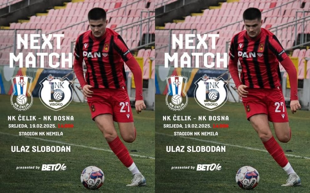 Utakmica NK Čelik – NK Bosna Visoko igrat će se na stadionu NK Nemila u Nemili od 14 sati, a ulaz na utakmicu je slobodan.