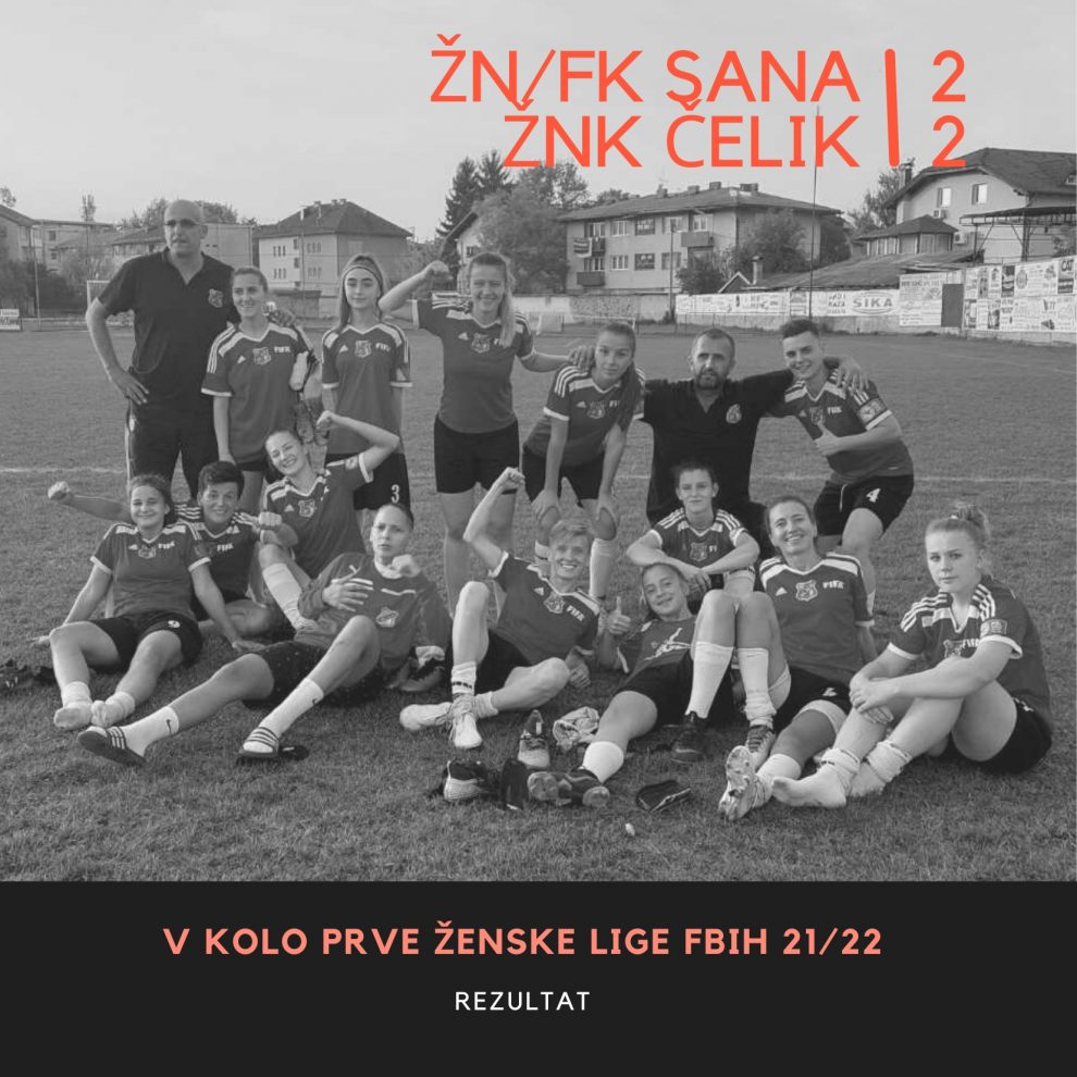 U dosta neizvjesnoj utakmici, nogometašice Čelika uspjele su odigradi neriješeno u Sanskom Mostu protiv neugodne ekipe „Sana 2014“, od koje su u prošloj sezoni doživjele dva poraza. Povele su Zeničanke u 2′ preko Ulmije Lužić/Čančar, a domaće su izjednačile na 1:1 u 9′ preko Ajne Golić. Domaće su preokrenule rezultat na 2:1 u 61′ iz penala preko Dragane Vrsajko. Čelik je uspio da izjednači na 2:2 u 88′, ponovo, preko odlične Ulmije Lužić/Čančar. Čelik je trenutno na prvom mjestu sa 10 bodova, koliko imaju i ekipe „Željezničar 2011“ i Libero sa utakmicom manje.
