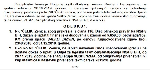 Naime, Disciplinska komisija Nogometnog saveza Bosne i Hercegovine na sjednici održanoj krajem oktobra rješavala je zahtjev za pokretanje postupka protiv Čelika podnesen putem Advokatskog društva Spaho iz Sarajeva, a odnosi se na igrača Jazvina, kojim se traži isplata finansijskih dugovanja.