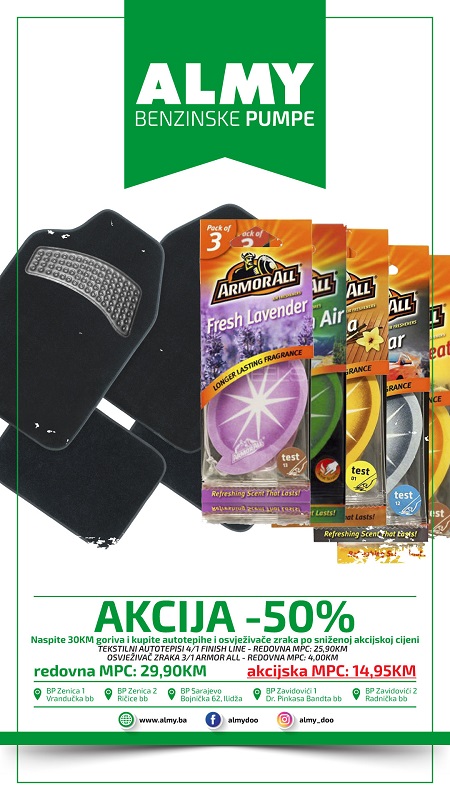 Cijenjeni kupci kompanije Almy, posjetite benzinske pumpe Almy u Zenici, Sarajevu i Zavidovićima, natočite goriva u vrijednosti od 30KM i ostvarite popust u iznosu od 50% na kupovinu autotepiha i automirisa u marketima benzinskih pumpi Almy! Akcija traje od 08.03. do isteka zaliha. Birajte najbolje, kompanija Almy!