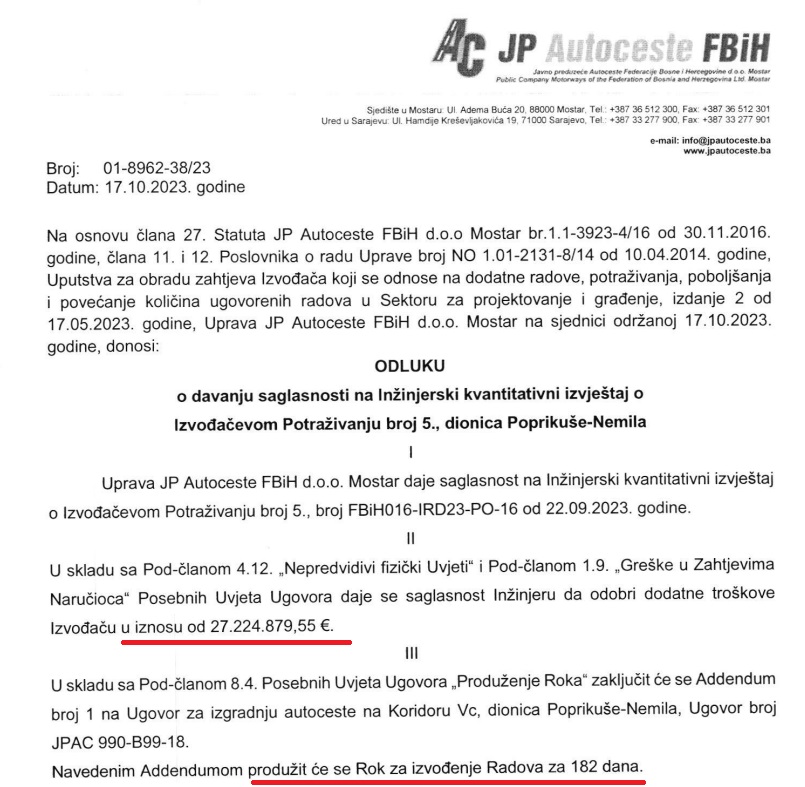 Međutim, niti će ova dionica biti završena u maju 2024. niti će koštati 407 miliona KM. Umjesto toga, prema odluci Autocesta FBiH od 17. oktobra, a do koje je došao Fokus, glavnom izvođaču radova, turskoj kompaniji Cengiz Insaat, koja je angažirana i na nizu drugih dionica, odobrena je isplata od dodatnih 53,2 miliona KM (27,2 miliona eura) i produžetak roka za izvođenje radova za dodatna 182 dana!