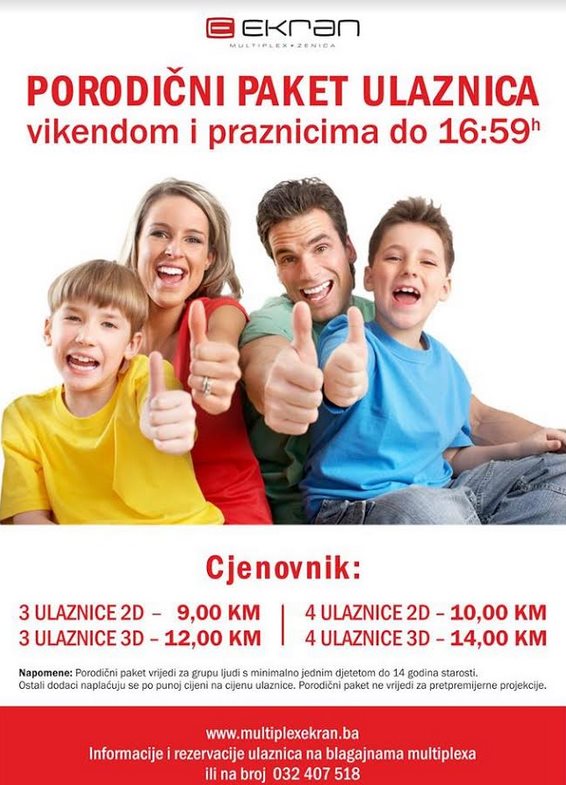 Ulaskom u 350. filmsku sedmicu Multiplex Ekran Zenica svojim posjetiocima otvara novu pogodnost vikendom i praznicima – PORODIČNI PAKET ULAZNICA.