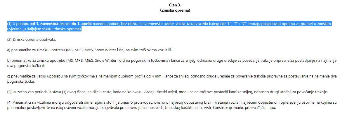 U periodu od 1. novembra tekuće do 1. aprila naredne godine, bez obzira na vremenske uvjete, vozila, izuzev vozila kategorije “L”, “T” i “C”, moraju posjedovati opremu za promet u zimskim uvjetima.
