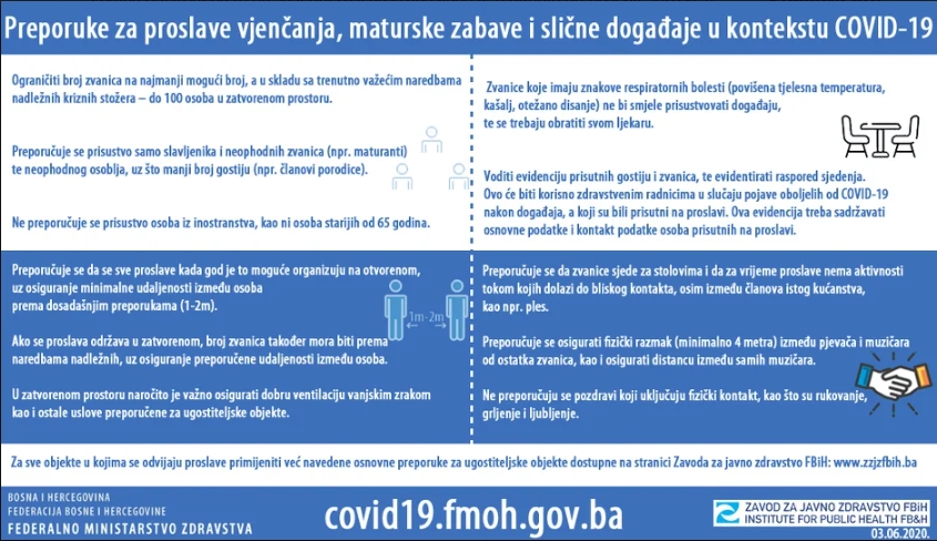 Nove epidemiološke preporuke u FBiH: Vjenčanja i proslave organizujte na otvorenom – Zavod za javno zdravstvo FBiH i Federalno ministarstvo zdravstva objavili su preporuke za održavanje proslava vjenčanja, maturskih zabava i sličnih događaja za vrijeme epidemije.