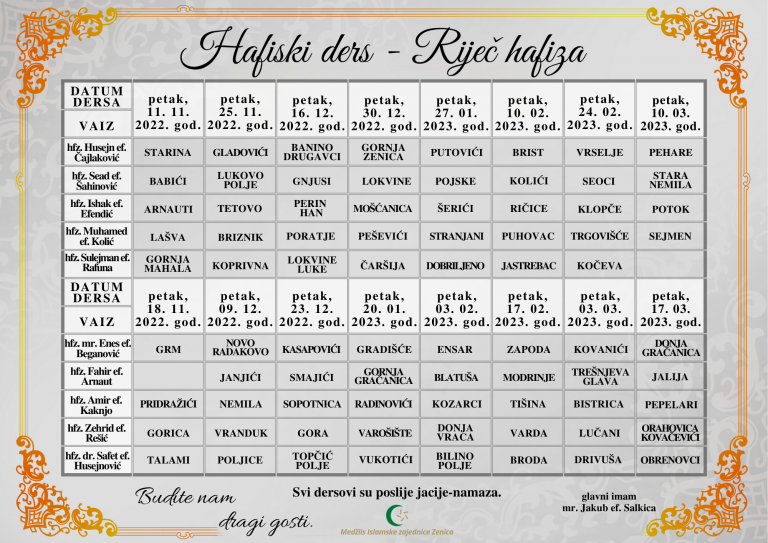 Edukativne sadržaje pod nazivom “Hafiski ders” u 77 džemata zeničkog medžlisa vodit će hafizi, a dersovi će se održavati svakih 15 dana počevši od petka 11. novembra 2022. godine pa do mjeseca marta.