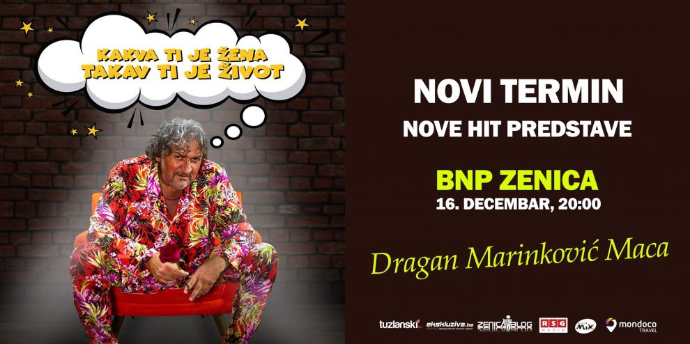Nakon raspodane prve predstave 27. novembra u Zenici Dragan Marinković Maca će nastupiti ponovo u Bosanskom narodnom pozorištu 16. decembra u 20 sati. ’KAKVA TI JE ŽENA ,TAKAV TI JE ŽIVOT’’ je predstava koja ozbiljno utiče na psiho-fizičko stanje cijelog organizma.