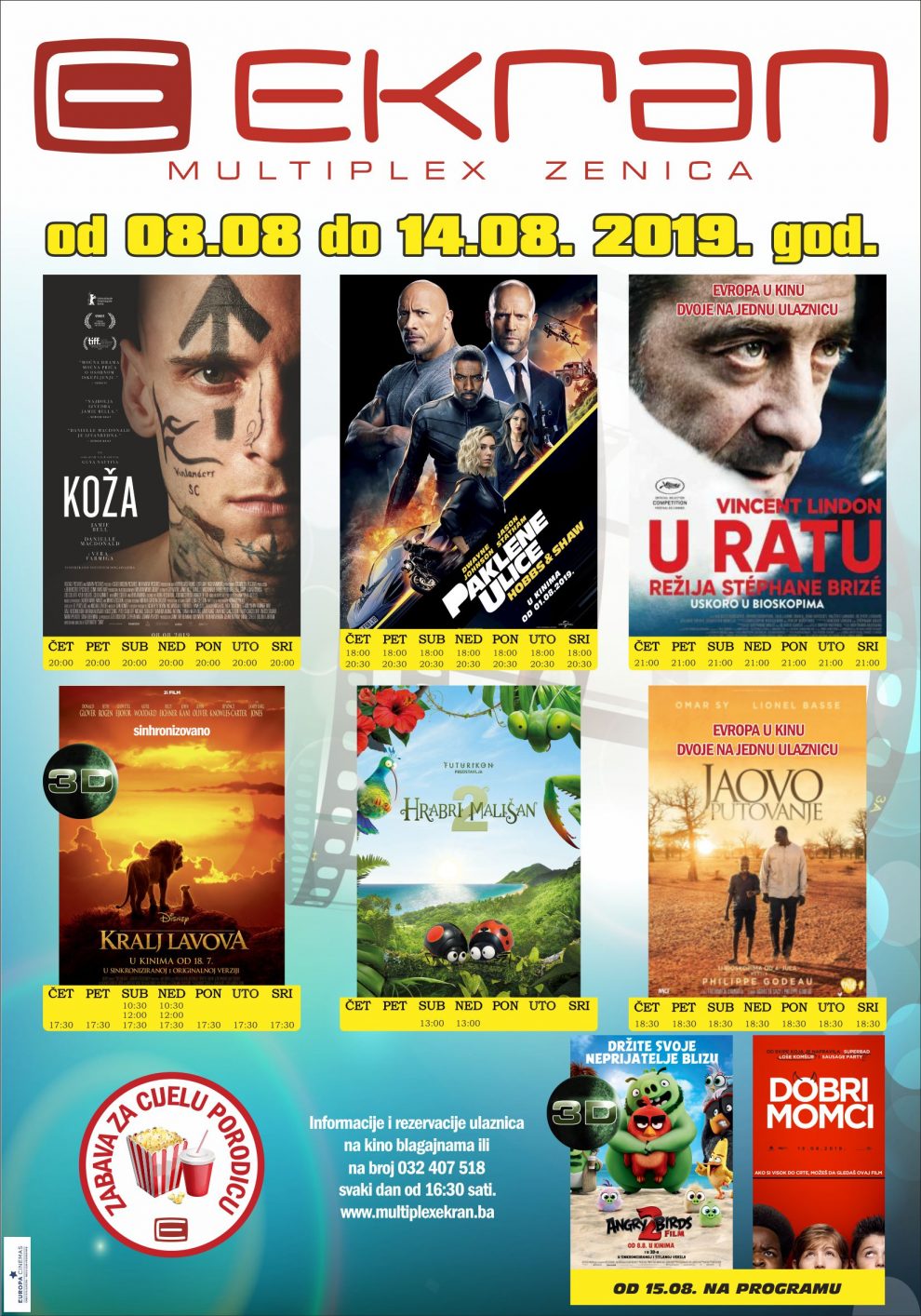 U prvoj sedmici revije bit će prikazani filmovi “Jaovo putovanje”, svaki dan od 18:00 sati i film “U ratu”, od 21:00 sat. I u narednoj sedmici publika će imati priliku gledati akcijski sprektakl godine “PAKLENE ULICE – HOBBS & SHAW”, kao i filmove namijenjene najmlađima. Filmski raspored i termine igranja moguće je preuzeti na: http://bit.ly/2KuOIBc, a sve informacije kao i rezervacije ulaznica moguće je izvršiti na broj telefona: 032 407 518, svakim radnim danom poslije 17h, a vikendom tokom cijeloga dana.