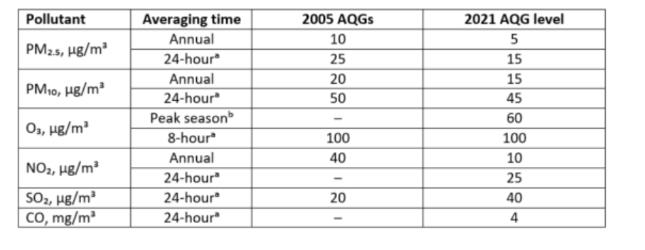 Na osnovu novih dokaza utjecaja na zdravlje, sada se državama preporučuje da ograniče sitne čestice PM2.5 na pet mikrograma po kubičnom metru zraka tokom godine (5 μg/m3), dok su posljednje smjernice iz 2005. godine sugerisale da se godišnje razine PM2.5 drže ispod deset mikrograma po kubnom metru zraka (10 μg/m3 ).