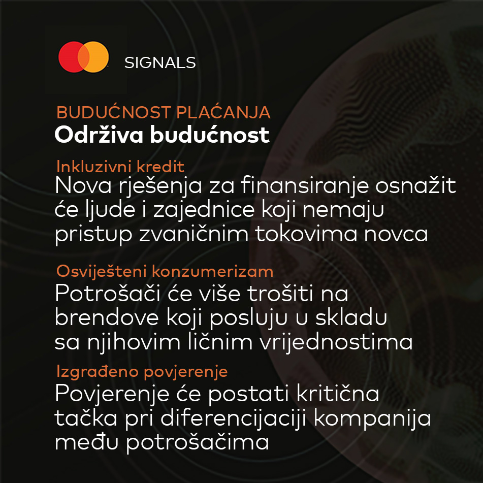 • Osviješteni konzumerizam – Potrošači će sve više nagrađivati kompanije koje u praksi podržavaju njihove lične društvene, etičke i ekološke ciljeve. S tim u vezi, Mastercard je sarađivao sa kompanijom Doconomy na razvoju Kalkulatora ugljičnog otiska, koji omogućava finansijskim institucijama i trgovcima da ugrade metriku za praćenje ugljičnog otiska u svoje aplikacije kako bi potrošači mogli u realnom vremenu imati uvid u procijenjeni CO2 otisak svih svojih kupovina.