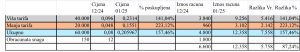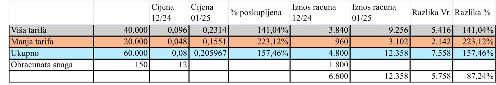 U izračunu kojeg možete vidjeti u nastavku na konkretnom primjeru uspoređeni su cijene struje u decembru prošle i januaru ove godine iz kojeg se vidi da veliko povećanje cijena, s tim da je u cijeni iz decembra i obračunata snaga, što nije slučaj s januarom na ovom primjeru.