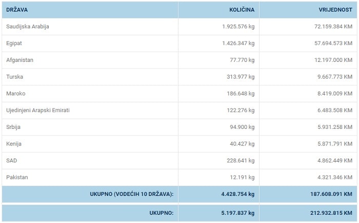 Lani je najviše ovih proizvoda izvezeno u Saudijsku Arabiju, u iznosu od 72 miliona KM, oko tri miliona manje nego godinu ranije.
