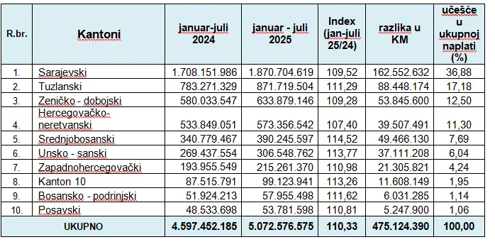 Porezna uprava Federacije BiH obavještava javnost da su porezni obveznici Federacije BiH u periodu januar-juli 2025. godine uplatili 5.072.576.575 KM javnih prihoda, što je u odnosu na isti period 2024. godine više za 475.124.390 KM, ili za 10,33%.