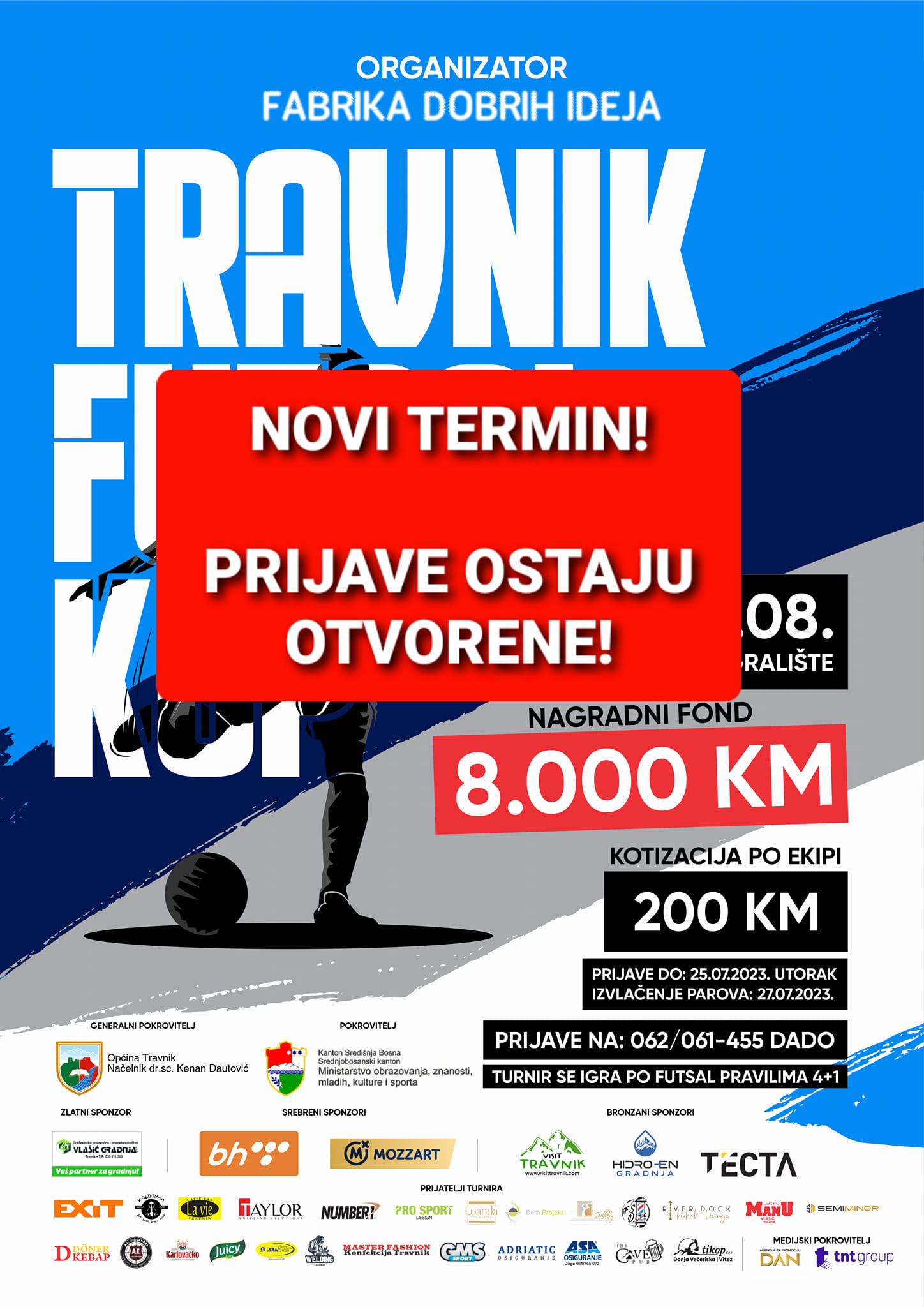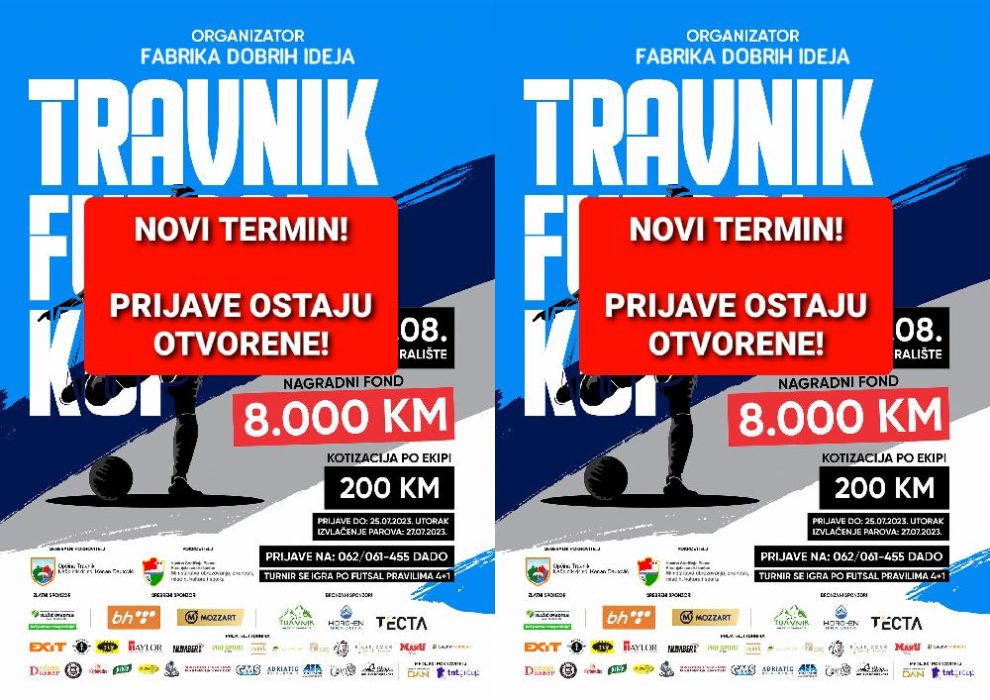 Futsal turnir „Travnik futsal kup“ održavati će se od nedjelje,06.08.2023. godine, a ne kako je ranije najavljeno od 29.07.2023. godine.