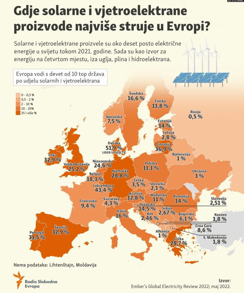 BiH trenutno proizvodi tek oko 2,5 posto električne energije koristeći potencijal sunca i vjetra. Zemlje poput Španije i Portugala, sa druge strane, proizvode više od trećine električne energije iz ovih izvora.
