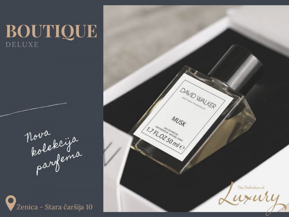 David Walker parfimerije nadopunjuju svoju kolekciju sa novom serijom parfema Boutique deluxe. Kolekcija je inspirisana predivnim cvjetovima, mirisnim šumama, delikatnim mirisima biljakama, bobicama u mediteranskim dolinama i venecijanskim vrtovima. David Walker je kreirao jedinstvenu kolekciju parfema za muškarce i žene. Posebno odabrane parfemske kompozicije, uvezene iz kolijevke parfemske umjetnosti iz Francuske i Italije, prilagođeni za širok spektaru kupaca. Sa 24% do 30% čistom parfemskom esencijom i skupom mirisnom harmonijom, svaki miris će biti izražajan i evoluirati tokom upotrebe. Boutique kolekcija, koja ima 14 različitih mirisa, po 50 ml učinit će da i najzahtjevniji kupci pronađu nešto za sebe. Lijepo uređene boce i posebna, rijetko korištena rigidbox ambalaža zadovoljit će ukus naših kupaca!