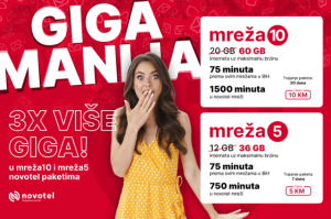 Ali to nije sve! Uz našu novu akciju Gigamanija, vaše iskustvo korištenja interneta dostići će potpuno novi nivo. Sada dobijate nevjerovatnih 3X VIŠE GIGA u našim novotel paketima na dopunu mreža10 i mreža5! To znači da možete istraživati, dijeliti sadržaj i ostati povezani više nego ikada prije, bez brige o ograničenjima podatkovnog prometa.