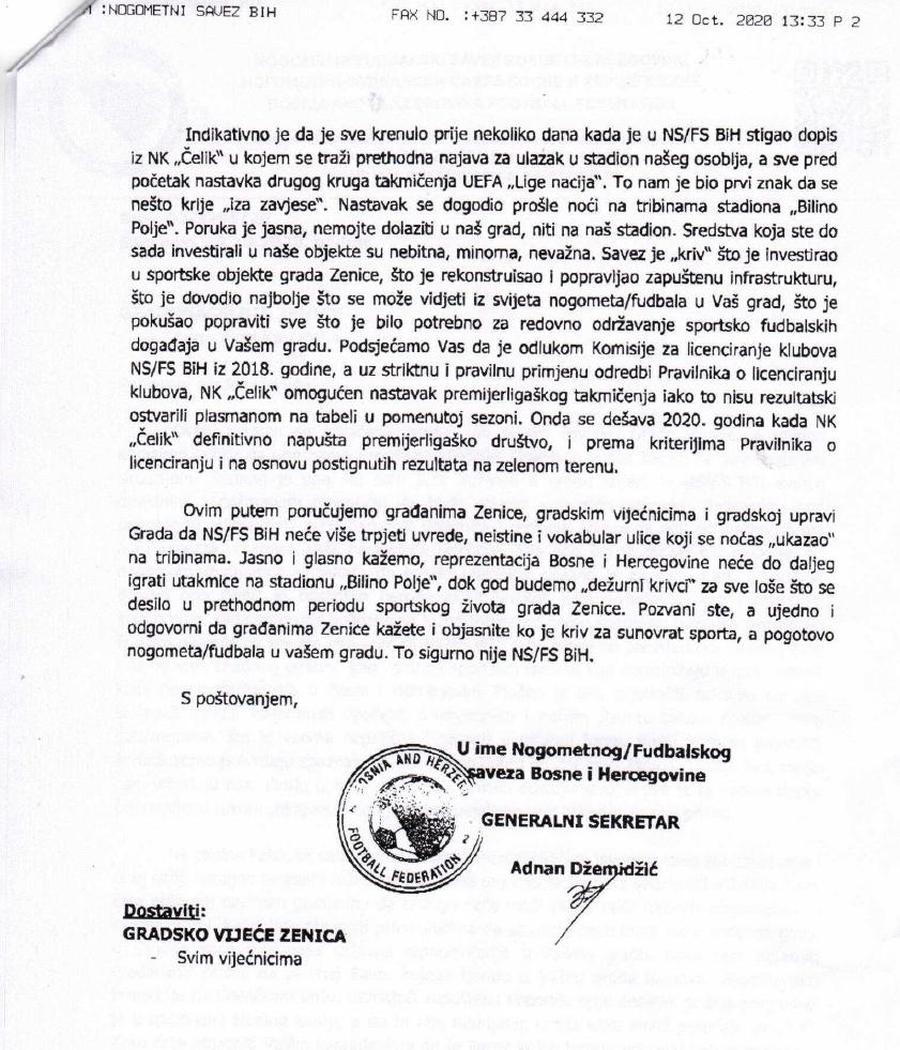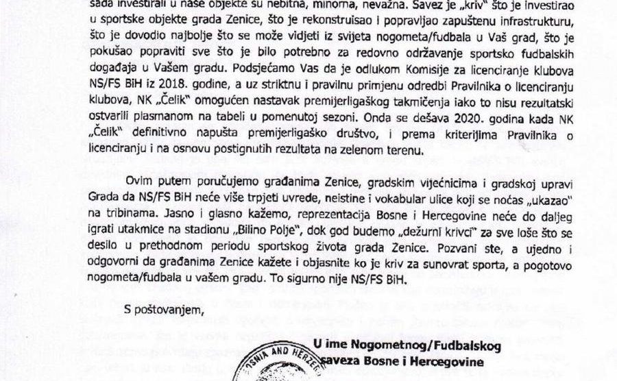 “Jasno i glasno kažemo – reprezentacija Bosne i Hercegovine neće do daljnjeg igrati utakmice na stadionu Bilino Polje dok god budemo ‘dežurni krivci’ za sve loše što se desilo u prethodnom periodu sportskog života grada Zenice”, stoji u pismu kojeg je u ime Nogometnog saveza BiH potpisao generalni sekretar Adnan Džemidžić.