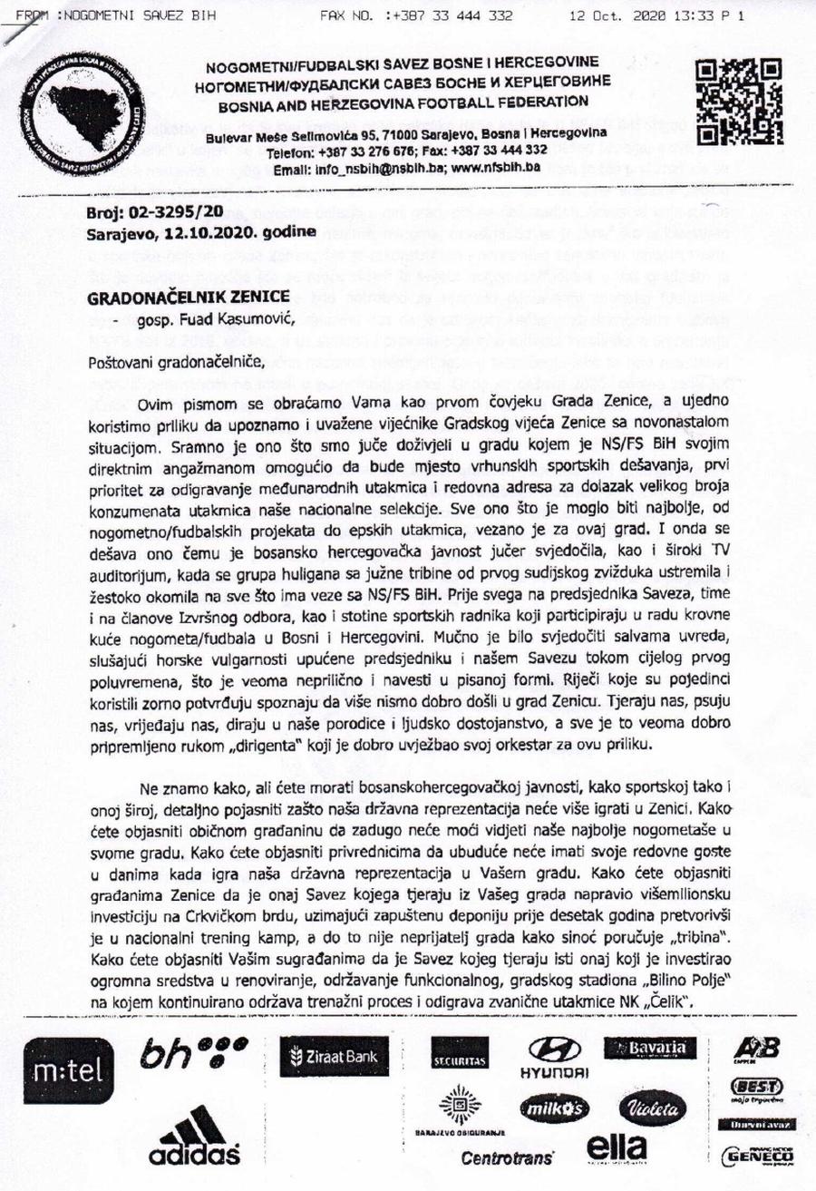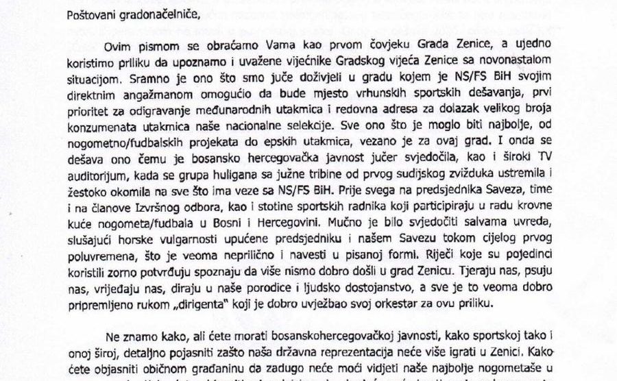 “Poštovani gradonačelniče, ovim pismom se obraćamo Vama kao prvom čovjeku Grada Zenice, a ujedno koristimo priliku da upoznamo i uvažene vijećnike Gradskog vijeća Zenice sa novonastalom situacijom. Sramno je ono što smo jučer doživjeli u gradu u kojem je NS BiH svojim direktnim angažmanom omogućio da bude mjesto vrhunskih sportskih dešavanja, prvi prioritet za odigravanje međunarodnih utakmica i redovna adresa za dolazak velikog broja konzumenata utakmica naše nacionalne selekcije. Sve ono što je moglo biti najbolje, od nogometnih projekata do epskih utakmica, vezano je za ovaj grad.