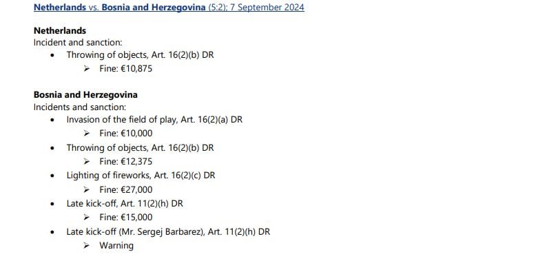 BiH mora platiti 64.375 eura zbog propusta na utakmici s Nizozemskom 7. septembra (10.000 eura zbog ulaska navijača na teren, 12.375 eura zbog bacanja predmeta, 27.000 pirotehnika i kašnjenje na start meča 15.000 eura).