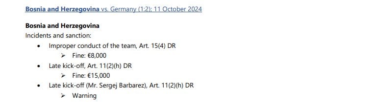Također, BiH je dobila kazne i zbog meča s Nijemcima na Bilinom Polju u iznous od 23.000 eura. Odnosno zbog nepropisnog ponašanja NS BiH 8.000 eura i kašnjenje na početak meča 15.000 eura.