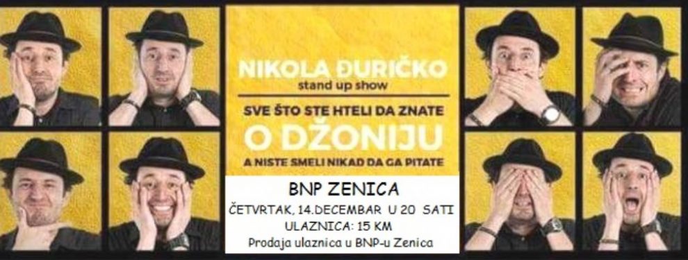 U četvrtak 14.decembra, sa početkom u 20 sati, na Velikoj sceni Bosanskog narodnog pozorišta Zenica gostuje Nikola Đuričko sa svojom Stand up komedijom „O DŽONIJU (Sve što ste oduvijek htjeli da znate o Džoniju, a niste smjeli da pitate)“.