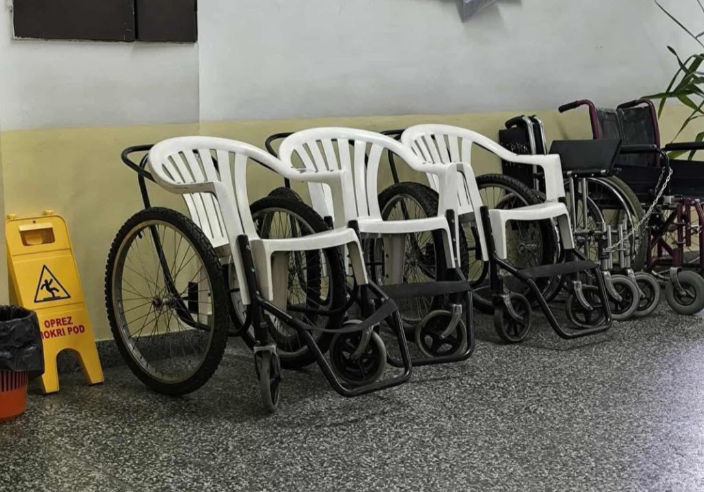 Fotografija kolica u Kantonalnoj bolnici Zenica, na kojima se jasno vidi plastična stolica montirana na postolje s točkovima, posljednjih dana širi se društvenim mrežama i izaziva burne reakcije javnosti.