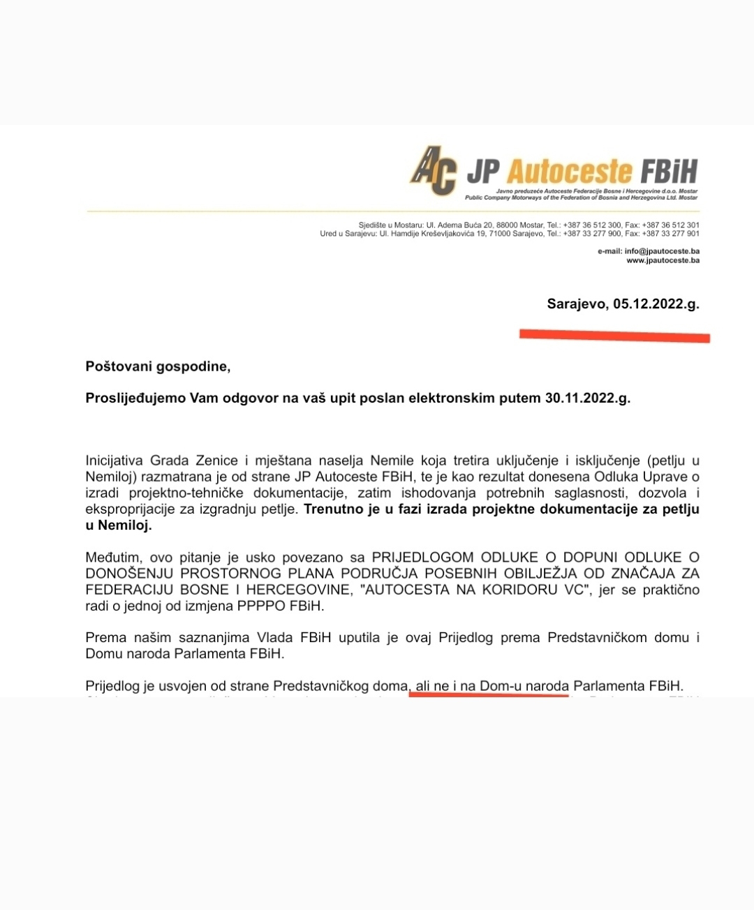 “Inicijativa Grada Zenice i mještana naselja Nemile koja tretira uključenje i isključenje (petlju u Nemiloj) razmatrana je od strane JP Autoceste FBiH, te je kao rezultat donesena Odluka Uprave o izradi projektno-tehničke dokumentacije, zatim ishodovanja potrebnih saglasnosti, dozvola i eksproprijacije za izgradnju petlje. Trenutno je u fazi izrada projektne dokumentacije za petlju u Nemiloj.
