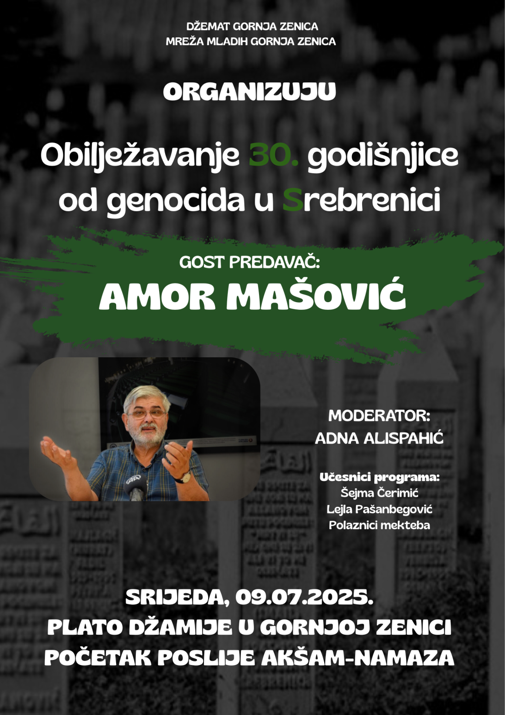 Program će biti održan na platou ispred džamije u Gornjoj Zenici, odmah nakon akšam-namaza, a glavni gost i predavač bit će uvaženi Amor Mašović – istraživač ratnih zločina, nekadašnji predsjedavajući Komisije za traženje nestalih osoba u BiH i dugogodišnji svjedok istine o srebreničkom genocidu.