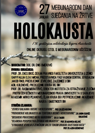 Obilježavanje Međunarodnog dana sjećanja na žrtve holokausta – 27. januar – Pravni fakultet Univerziteta u Zenici u saradnji sa Yad Vashem – the World Holocaust Remembrance Center Jevrejska zajednica u Bosni i Hercegovini Asocijacija nezavisnih intelektualaca Krug 99, Bosna i Hercegovina Institut za istraživanje zločina protiv čovječnosti i međunarodnog prava Univerziteta u Sarajevu ONLINE OKRUGLI STOL S MEĐUNARODNIM UČEŠĆEM