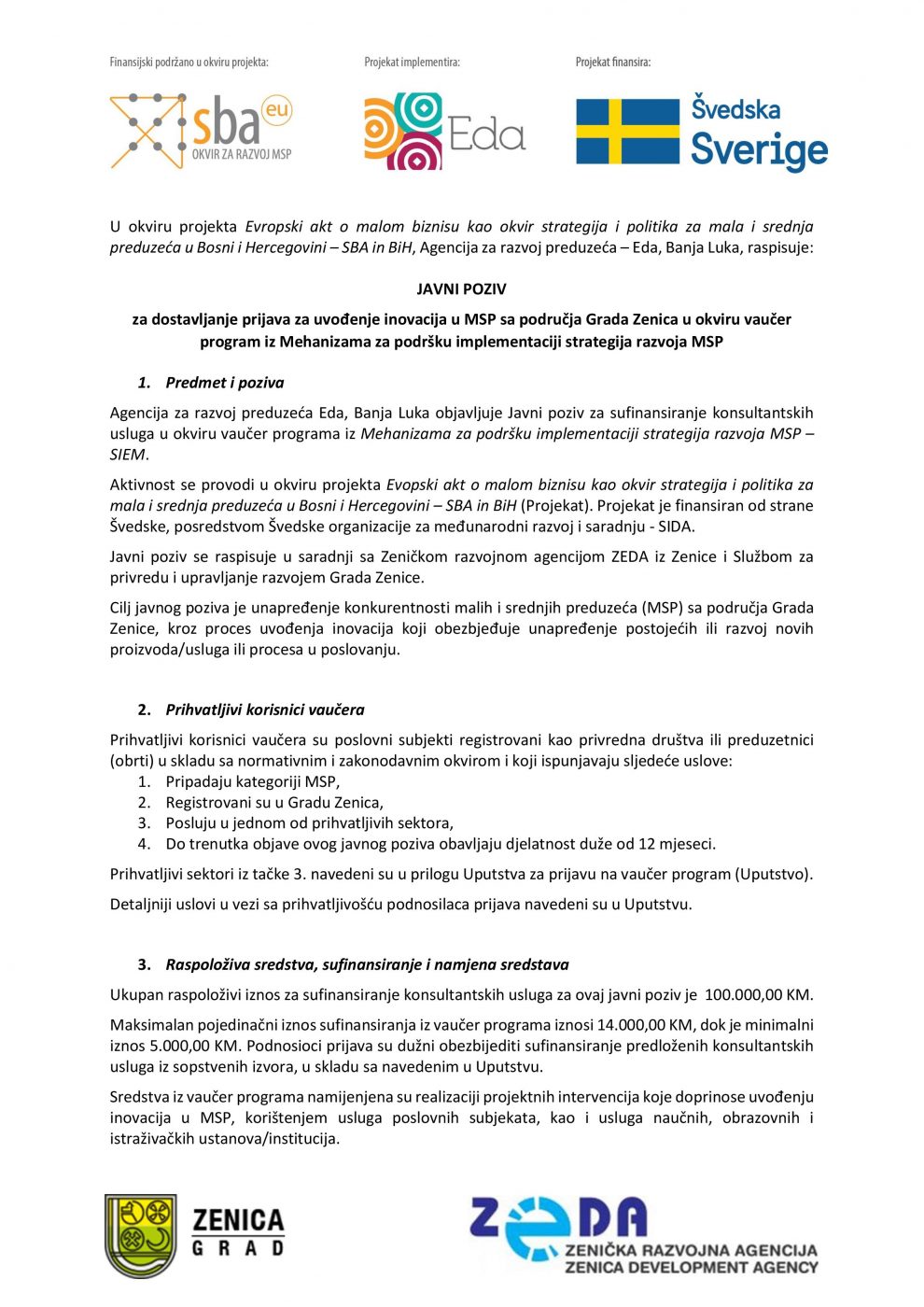 Javni poziv sa Uputstvom za prijavu i pratećim obrascima dostupan je na: https://edabl.org/objavljen-javni-poziv-za-dostavljanje-prijava-za-uvodjenje-inovacija-u-msp-sa-podrucja-grada-zenica/