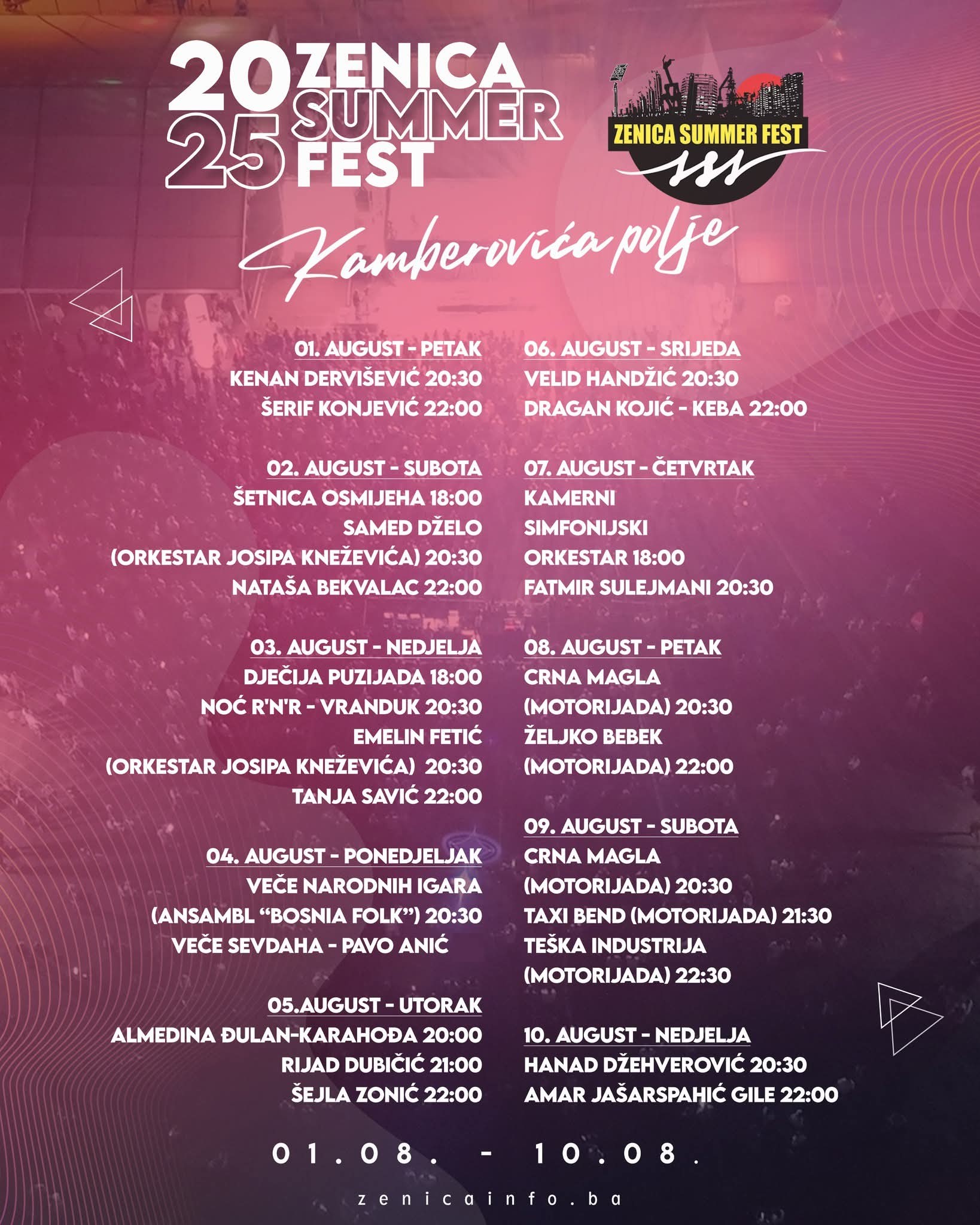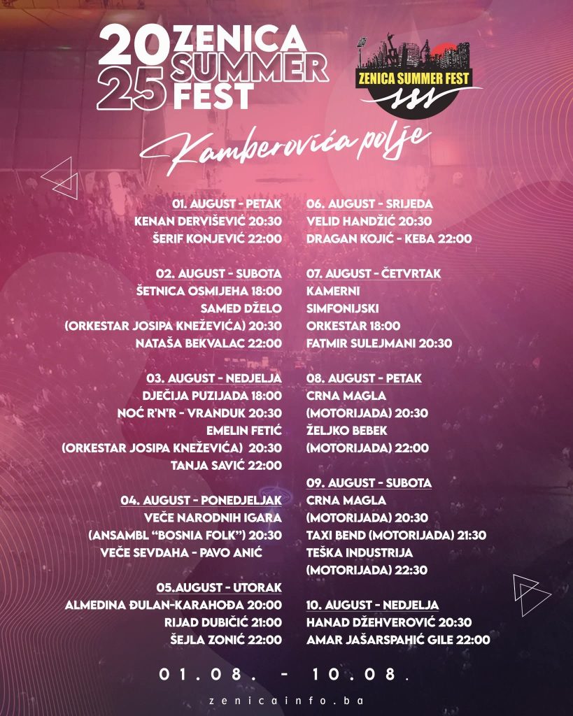 Jedan od najznačajnijih muzičko-kulturnih događaja ovog ljeta, Zenica Summer Fest 2025, održat će se od 1. do 10. augusta u Zenici, a većina događaja je planirano da se održi na Kamberovića polju, najavili su organizatori.