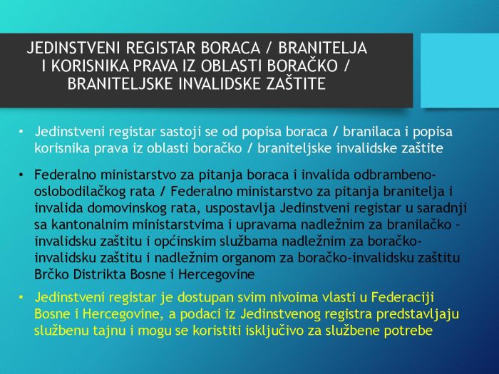 Registar je u skladu sa zakonom, naglasio je federalni ministar za boračka pitanja Salko Bukvarević, dostupan svim zvaničnim institucijama države te boračkim udruženjima i to u prostorijama odjeljenja Federalnog ministarstva za pitanje boraca i invalida odbrambeno-oslobodilačkog rata.