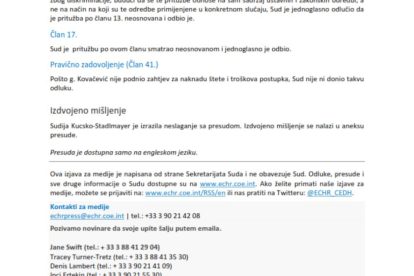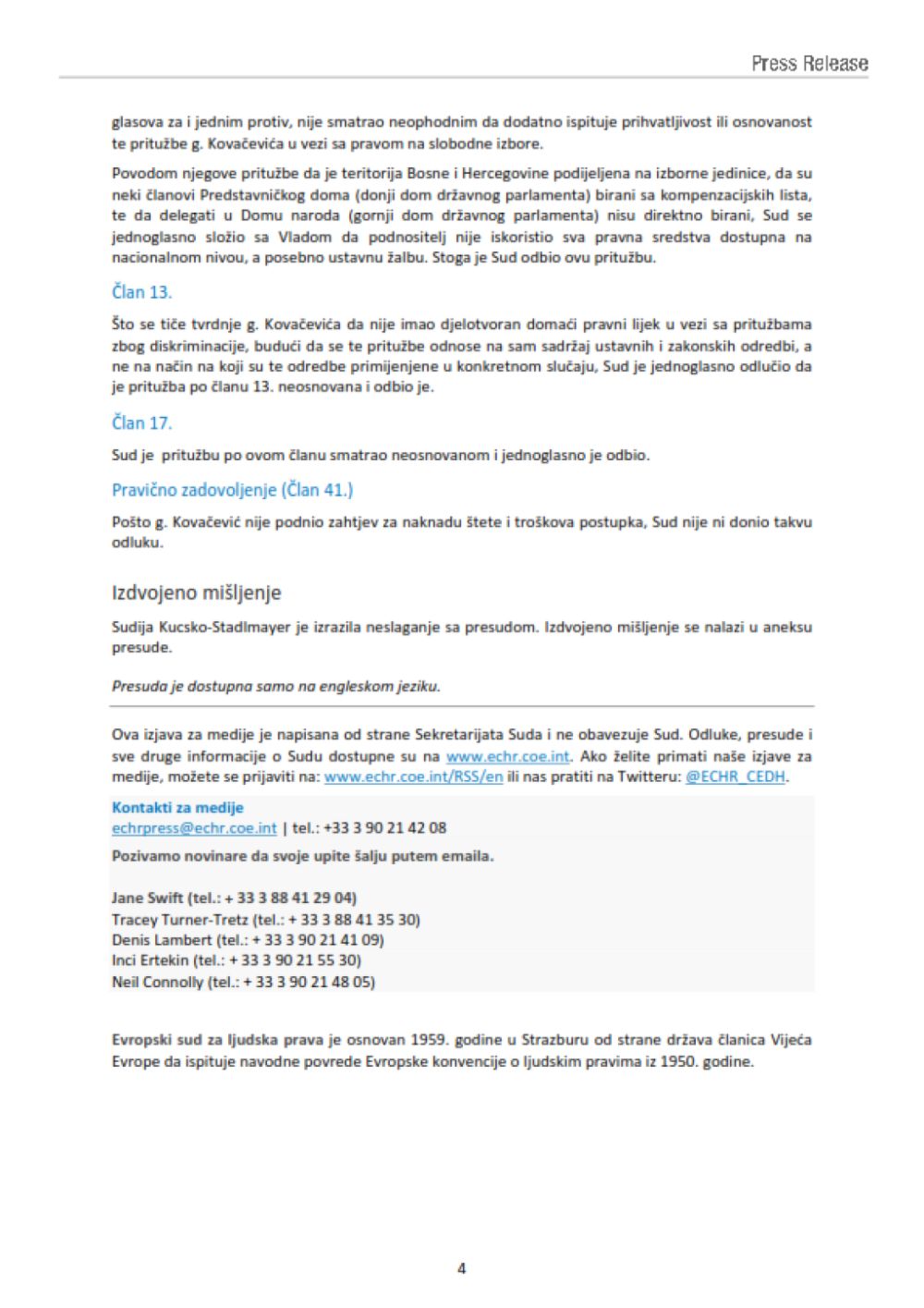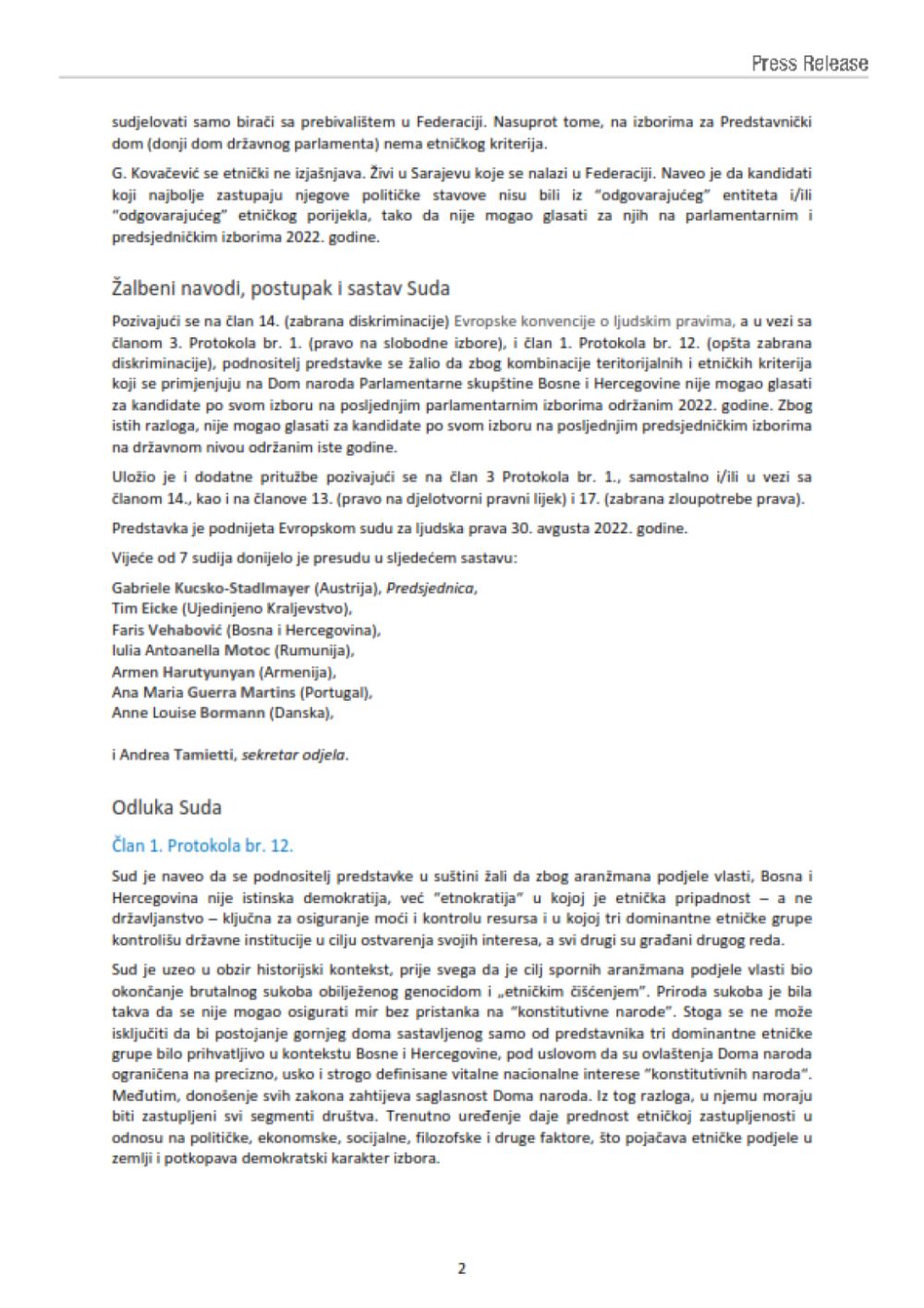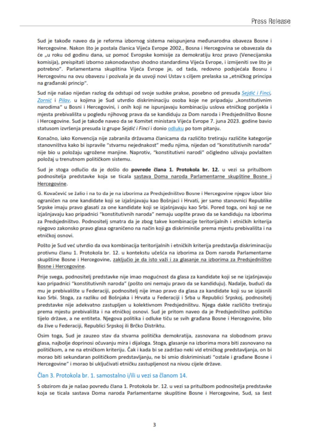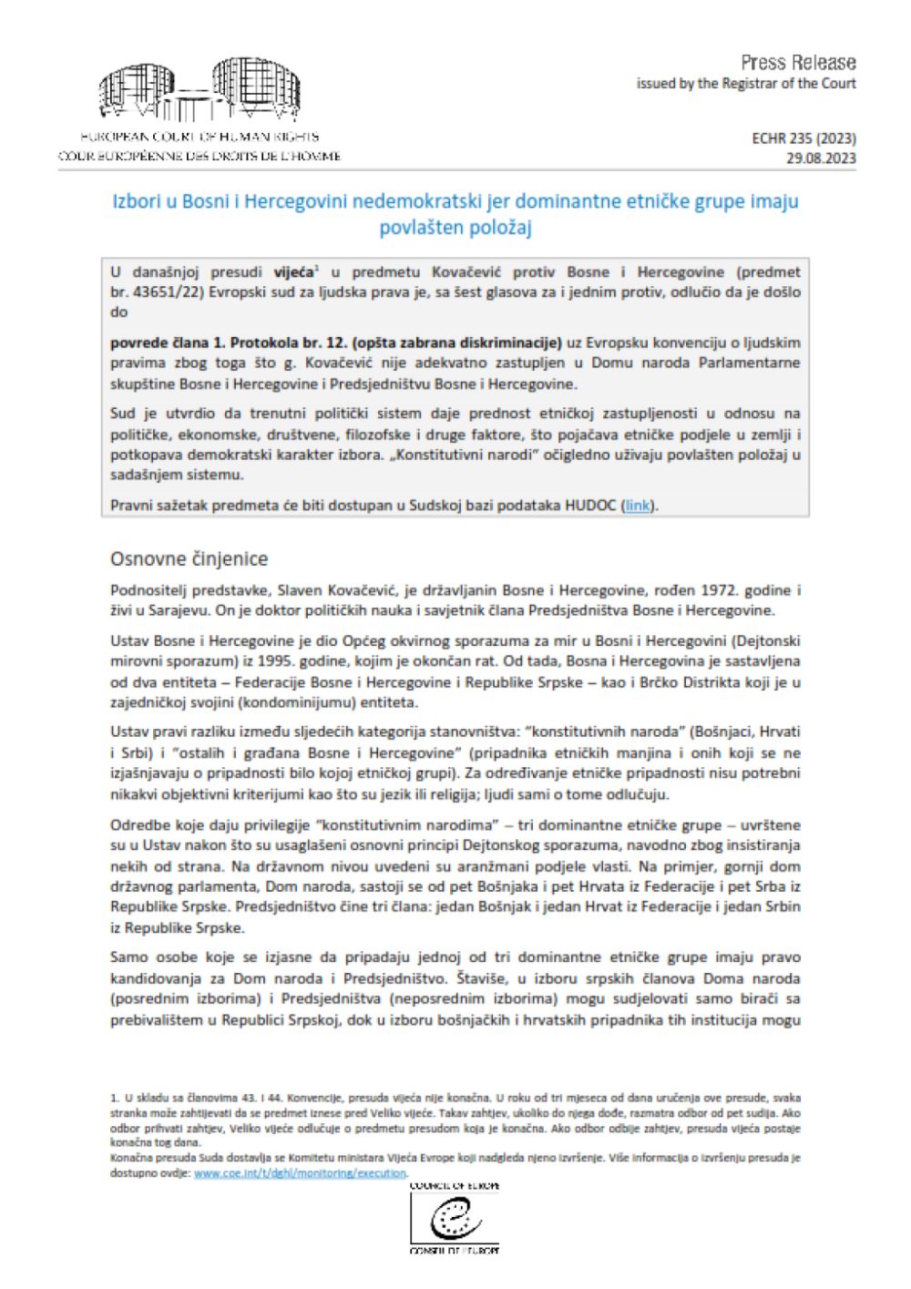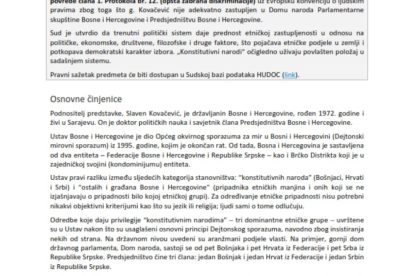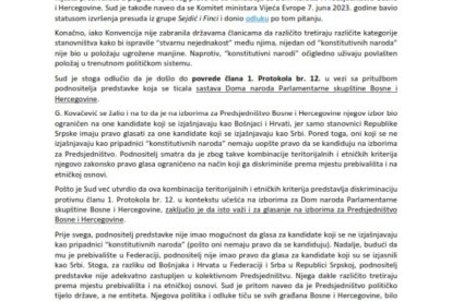 Sud je donio presudu po apelaciji Slavena Kovačevića u kojoj je utvrdio da su njegova prava prekršena, te da je diskriminisan, jer ne može glasati za kandidate za Dom naroda Parlamentarne skupštine Bosne i Hercegovine (PSBiH), te za članove Predsjedništva BiH koji ne pripadaju konstitutivnim narodima i ne žive u određenom entitetu.