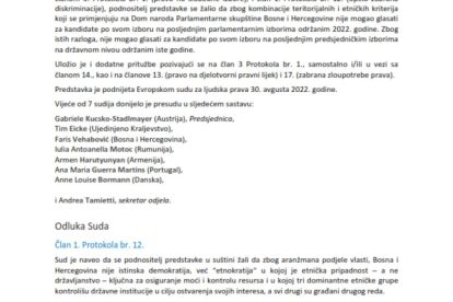 – Trenutno uređenje daje prednost etničkoj zastupljenosti u odnosu na političke, ekonomske, socijalne, filozofske i druge faktore, što pojačava etničke podjele u zemlji i potkopava demokratski karakter izbora – stoji u sažetku presude Evropskog suda za ljudska prava.