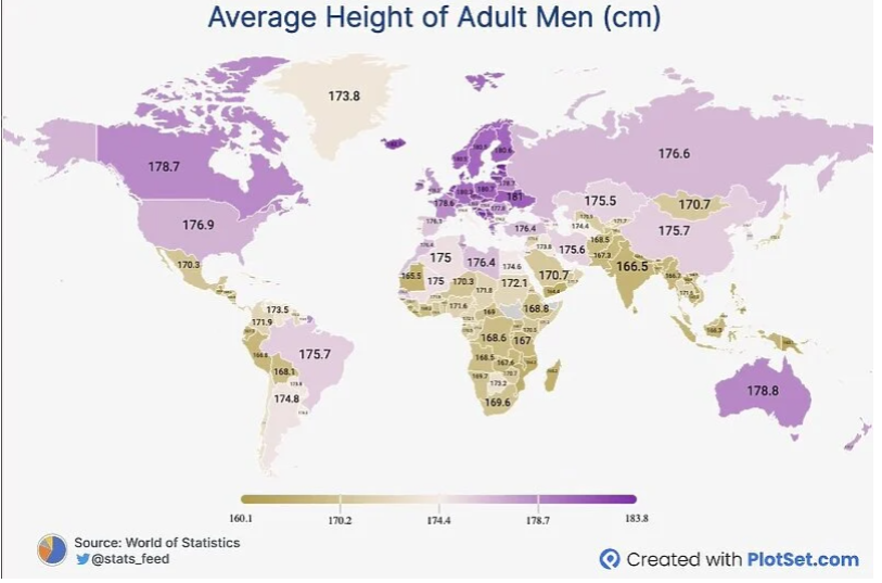 Uz listu najviših muškaraca svijeta po državama, organizacija World of Statistics predstavila je i mapu koja predstavlja prosjek visine muškaraca u svijetu.