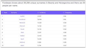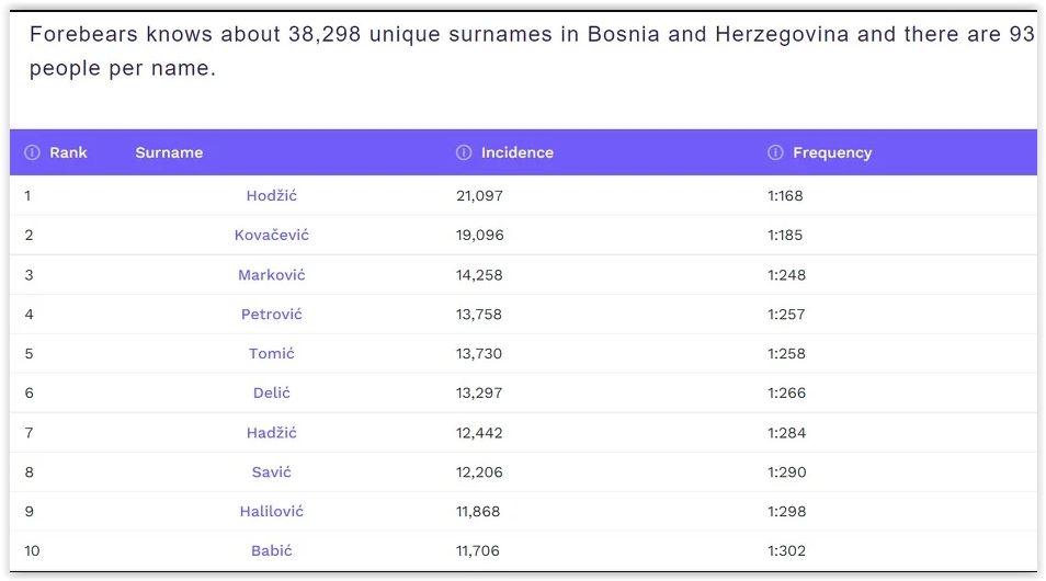 Prema stranici “Forebears” poslije Hodžića, u BiH je najviše Kovačevića pa Markovića.
