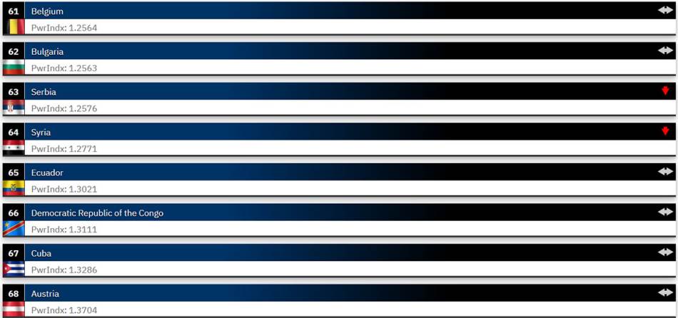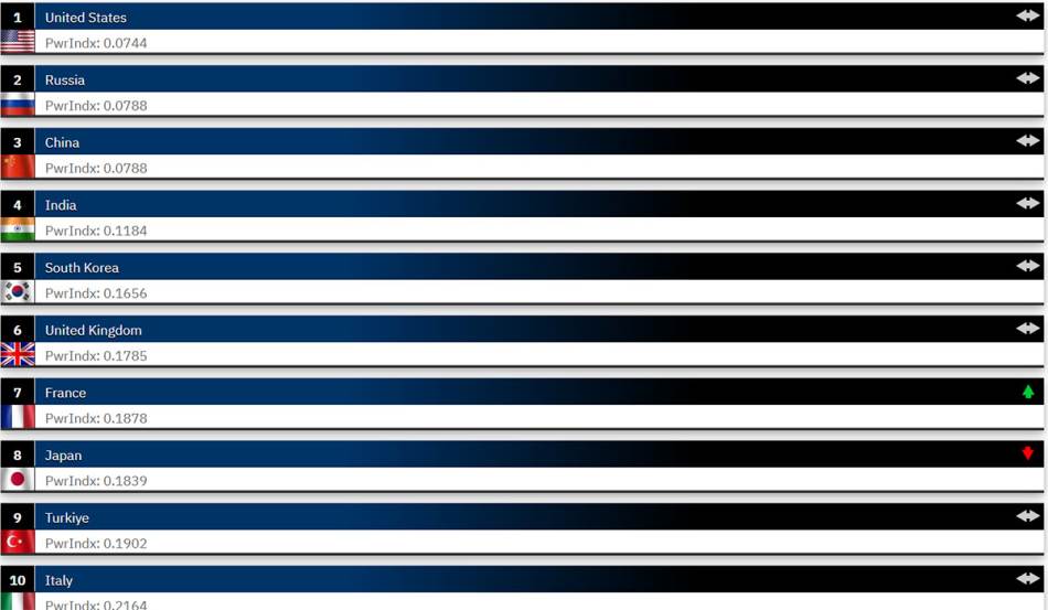 Top deset najmoćnijih vojski na svijetu zaokružuju Indija, Južna Koreja, Ujedinjeno Kraljevstvo, Francuska, Japan, Turska i Italija. Važno je napomenuti da Global Firepower ne uzima u obzir nuklearne arsenale u svojoj formuli, što omogućava realnije poređenje konvencionalnih vojnih kapaciteta.