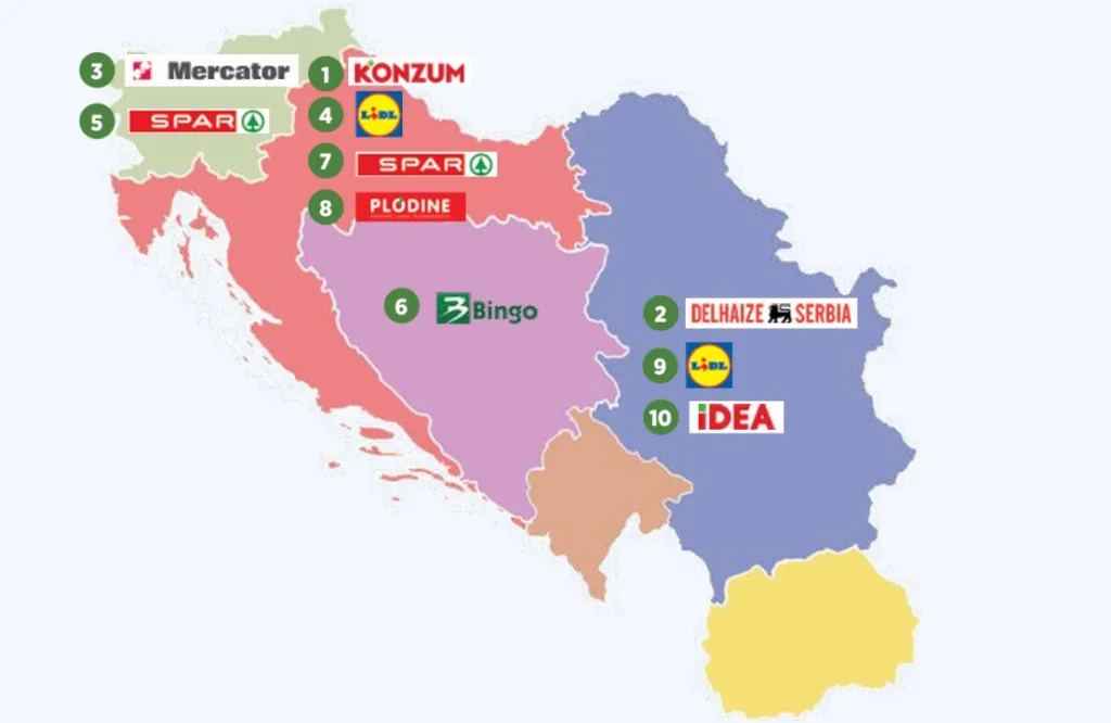 Najveći trgovac u regiji je hrvatski Konzum, a slijedi Delhaize Srbija koji upravlja Maxi marketima.